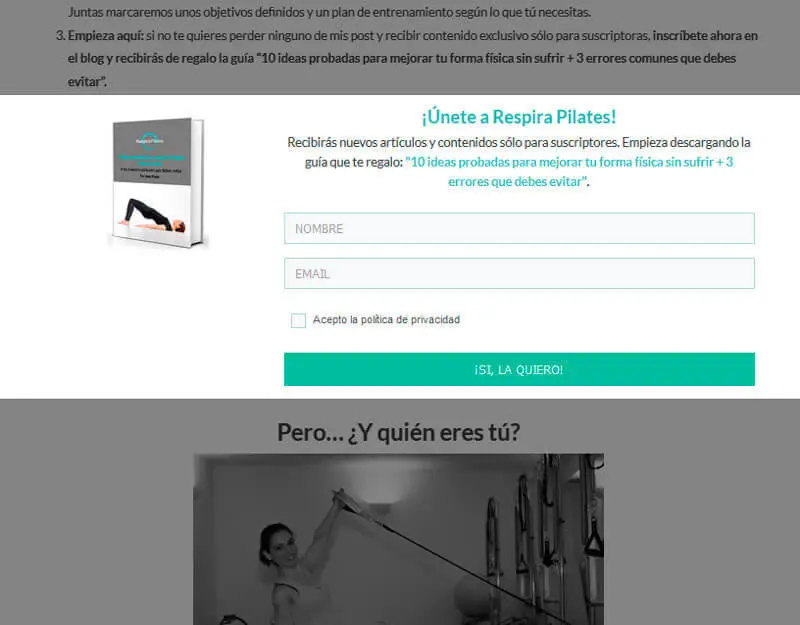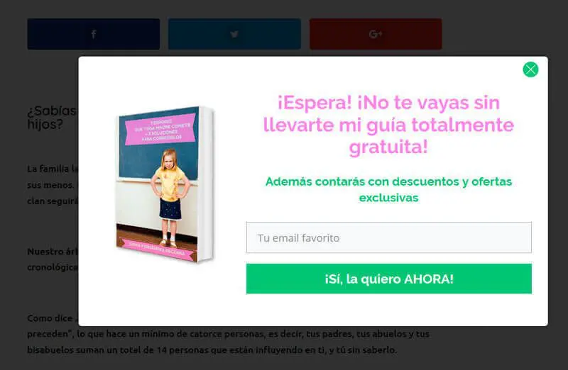 Imagina que un visitante está leyendo un artículo y al cabo de un tiempo, que tú has establecido con anterioridad, le salta una ventana en la pantalla para que deje su email a cambio de tu Lead Magnet.
